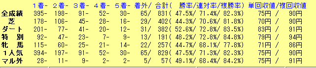 単勝(1着にくる)場合は2回に1回の確率以下で回収率は75%。