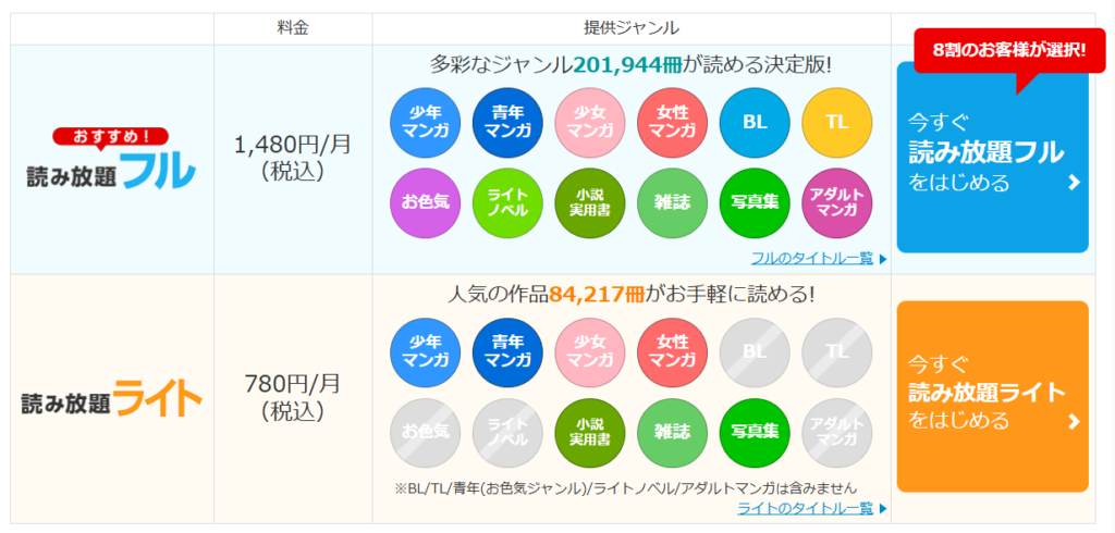 - 読み放題フル(月額1,480円):BL/TL/大人向け含む約17万冊。