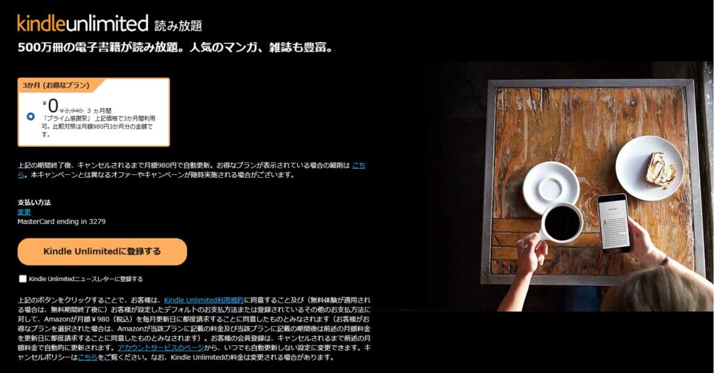 Kindle Unlimitedは3ヶ月2,940円のサービスですが、今だけ0円でお試し利用できます。